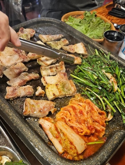 삼겹살은 두툼하게 썬 돼지고기를 직접 먹는 한국식 바비큐예요.